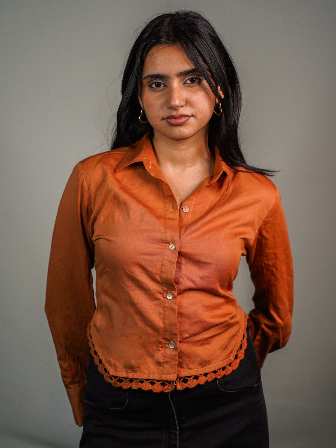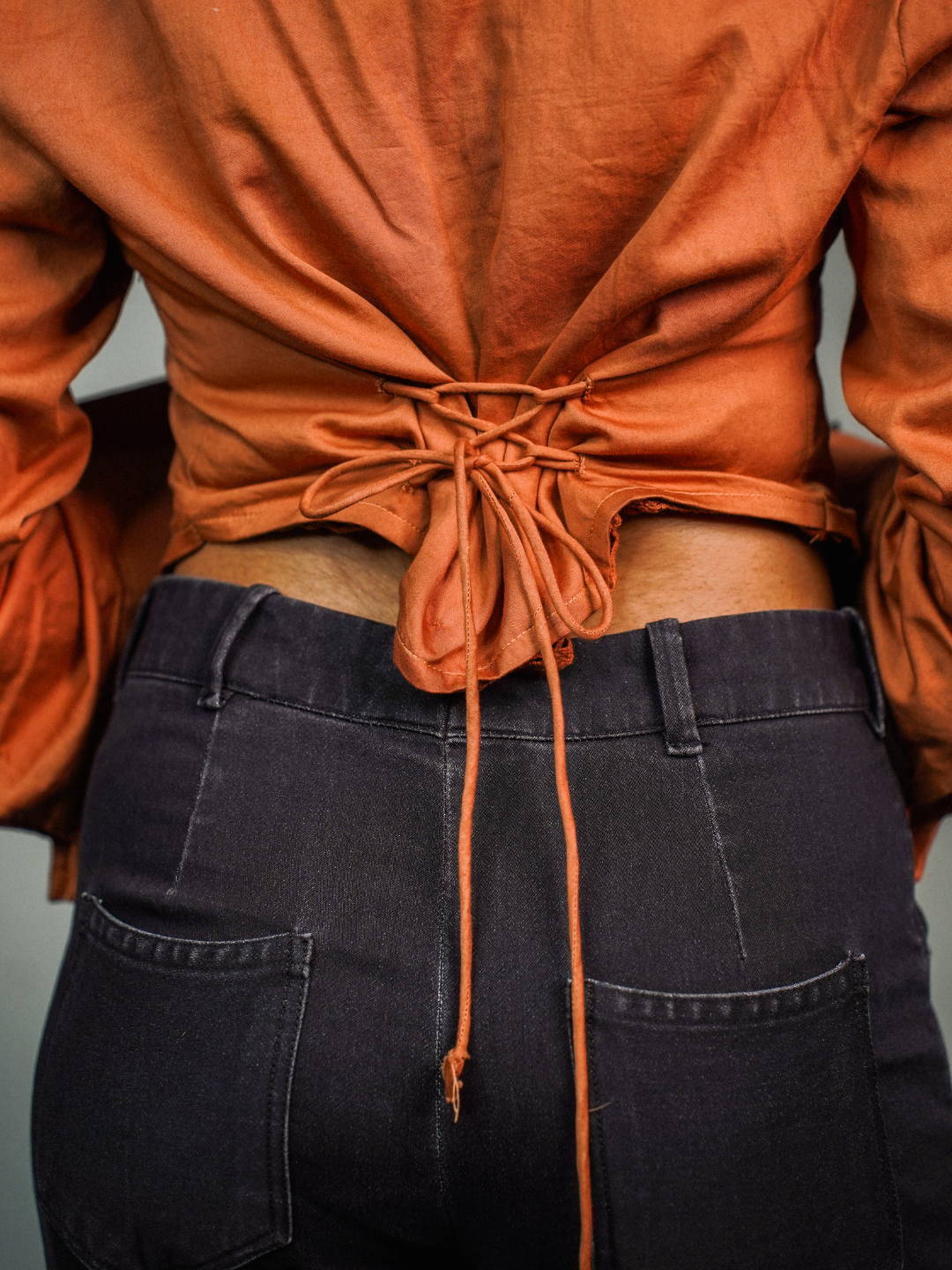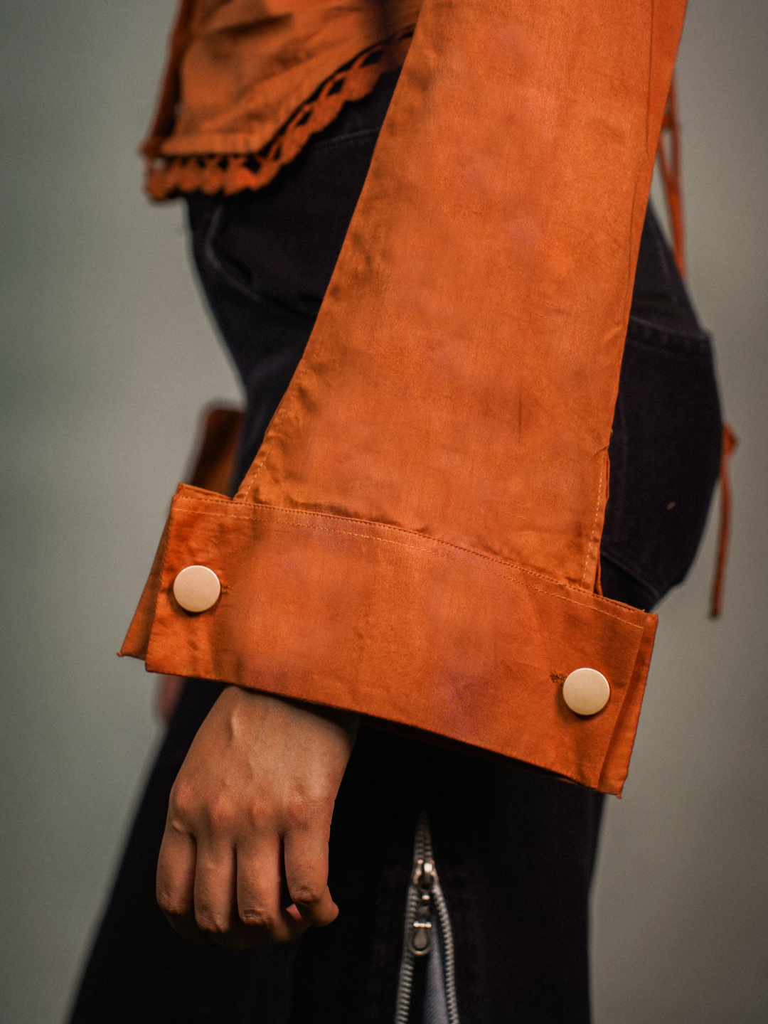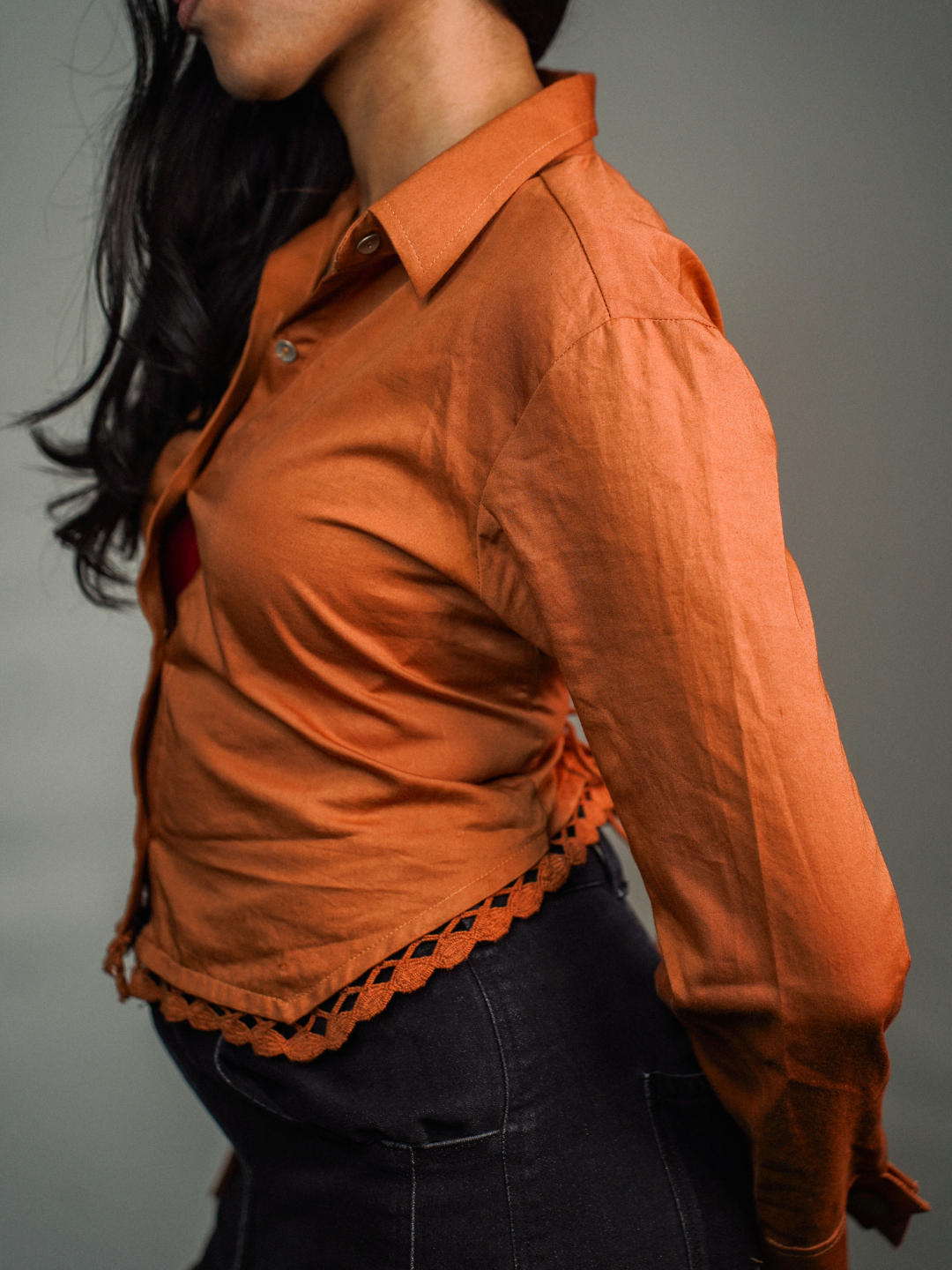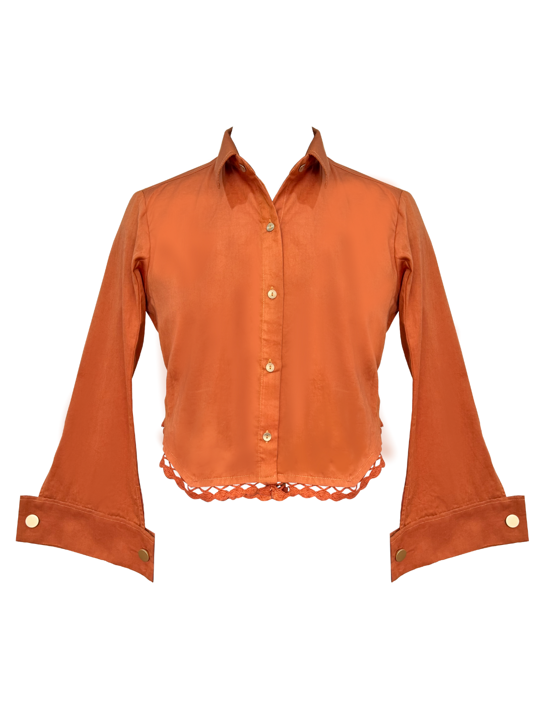 A beautifully tailored crop shirt in a warm mocha mousse shade, crafted in breathable cotton satin that feels as good as it looks. Designed for effortless elegance and versatility, this piece features long, flared sleeves with antique metal button detailing that add subtle charm. The waist is adjustable at the back, allowing you to cinch and tie it for a more defined silhouette or leave it easy and relaxed, styled to your liking.