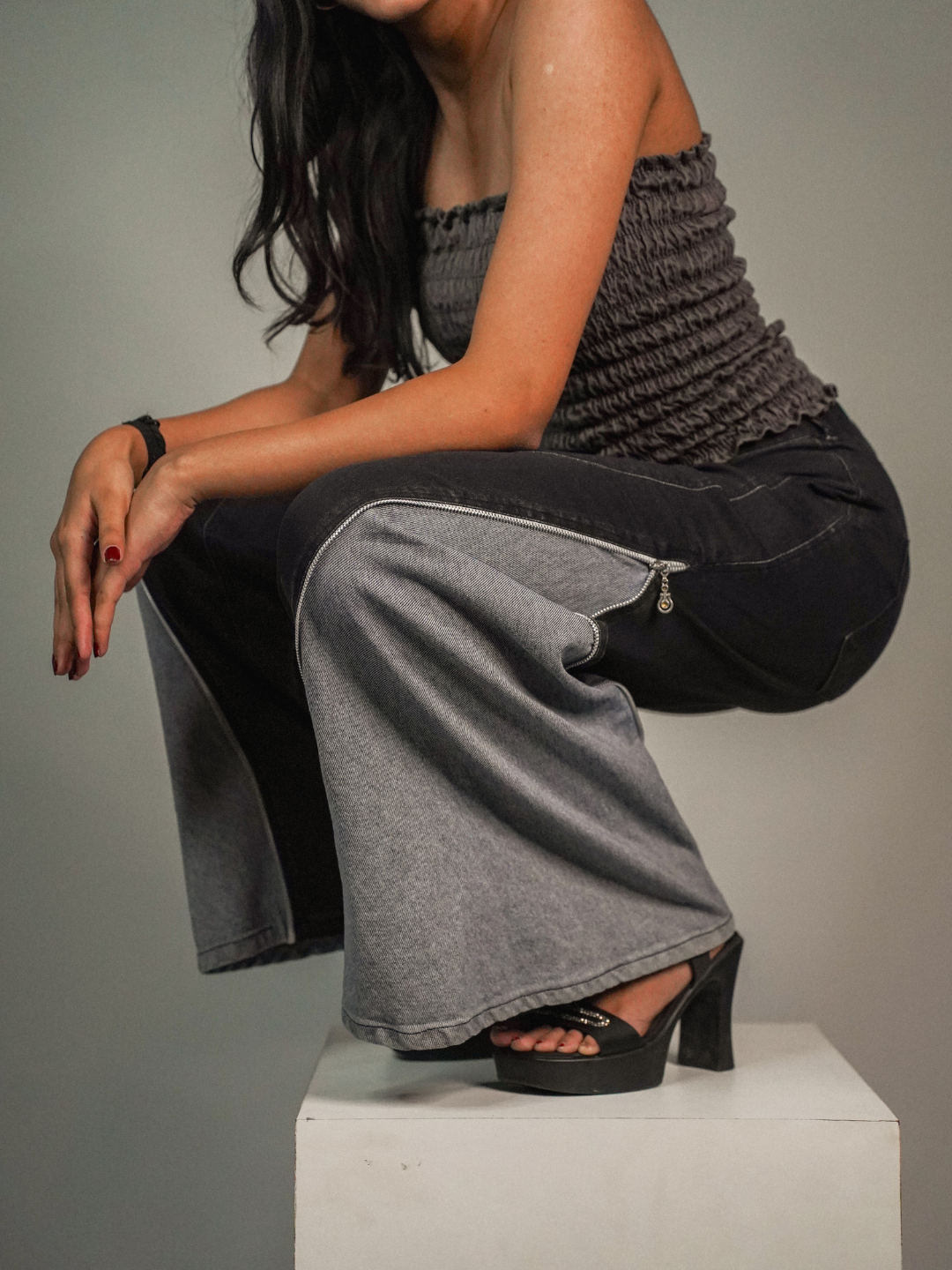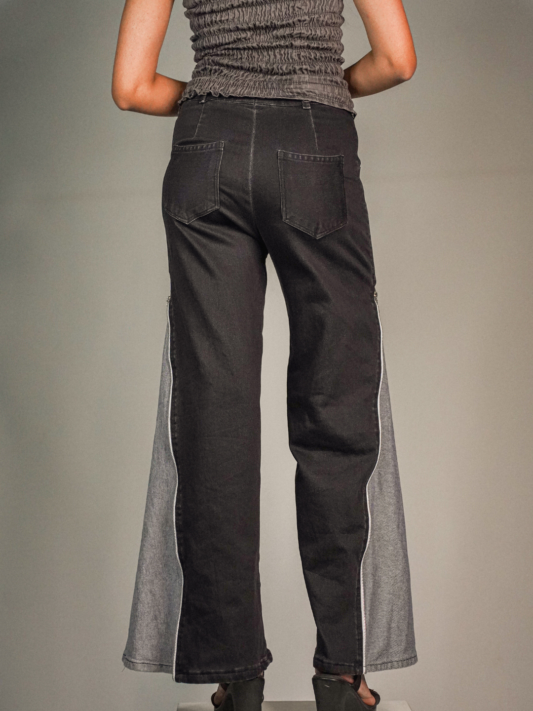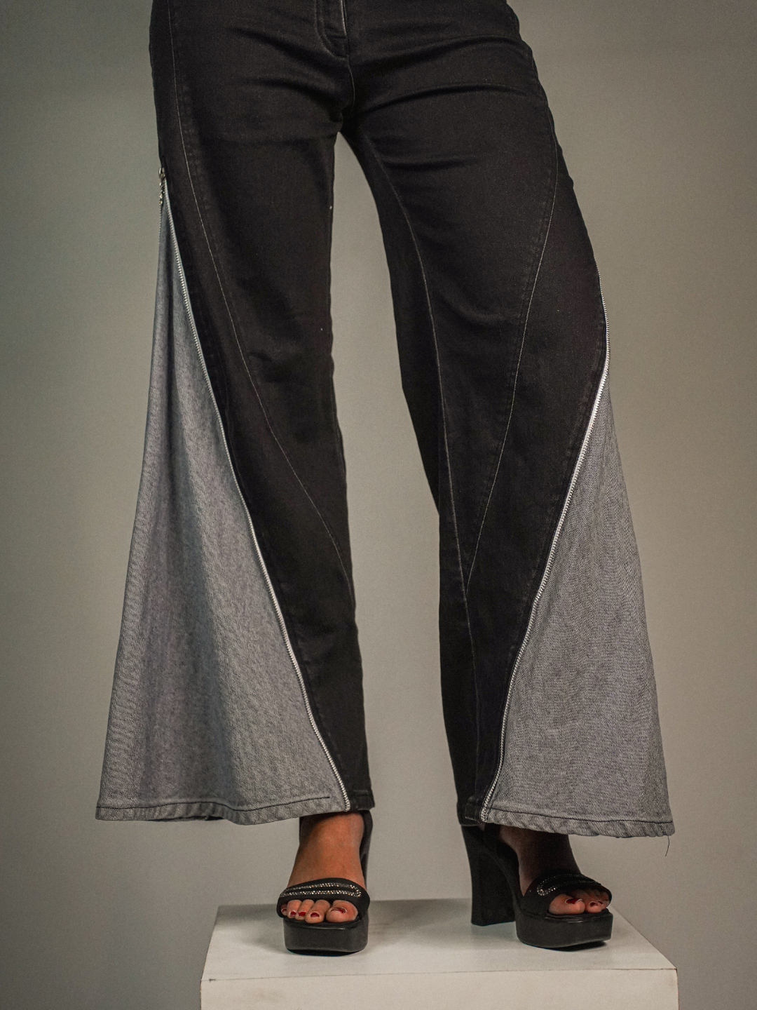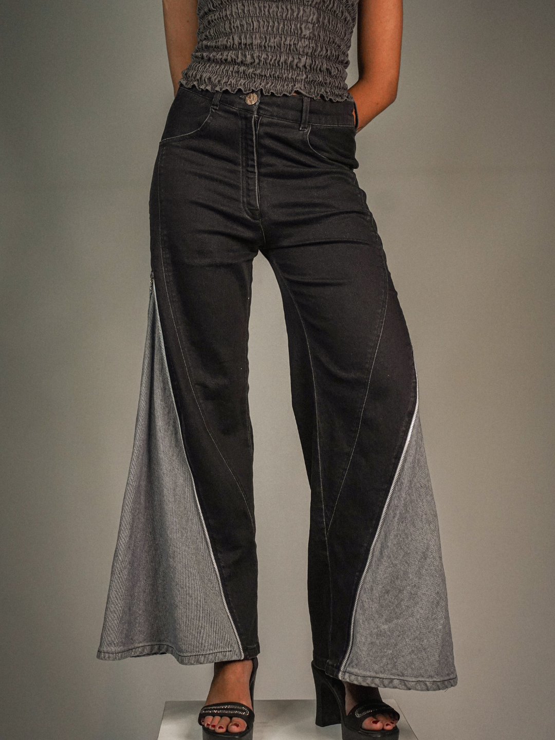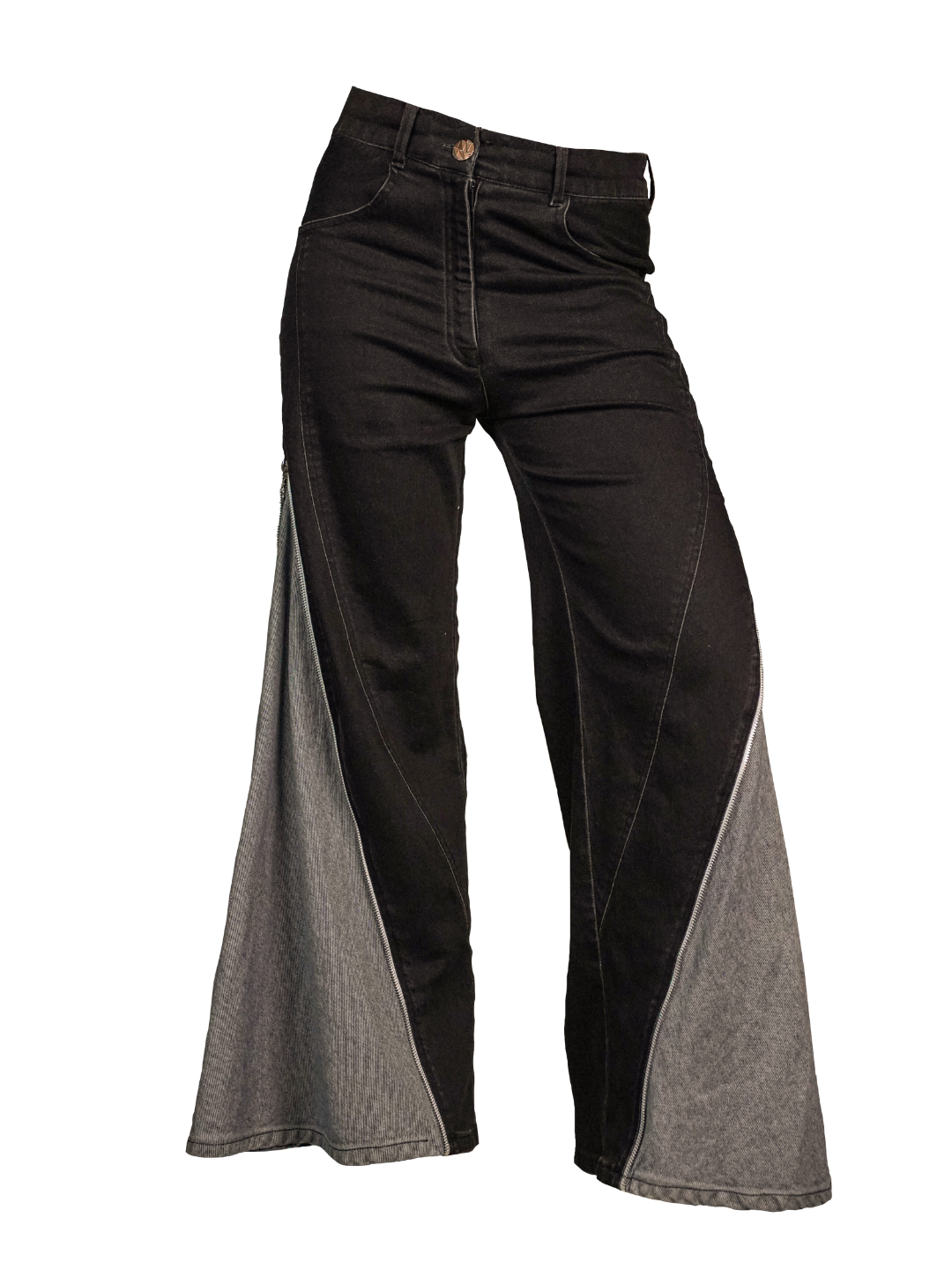 Crafted in rich black denim, the Ivy Pants are where rustic charm meets modern edge. Designed with dual personality, they seamlessly shift from structured to flared, thanks to two smartly placed zippers along the legs. Open them halfway for a subtle flair, or unzip fully to reveal bold grey inserts that add just the right touch of monochrome contrast. The result? A pair of pants that adapt to your style, mood, and moment. Sophisticated, versatile, and undeniably sharp, these pants are made to make a statement, your way.