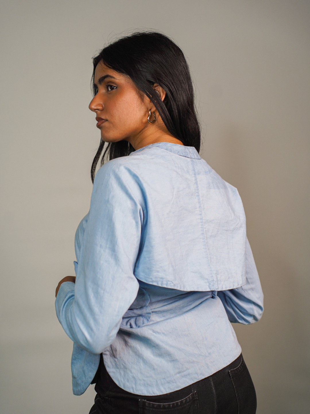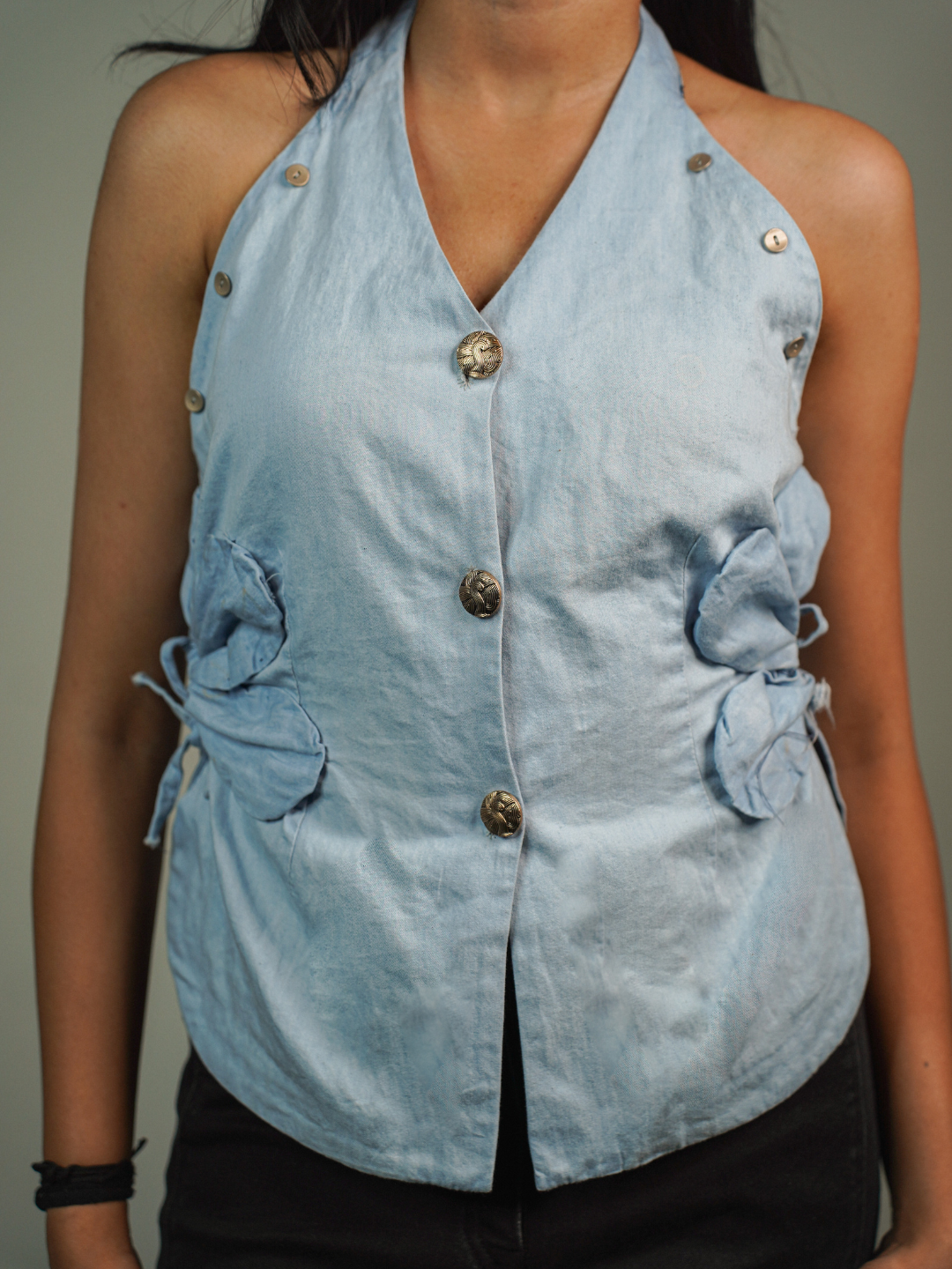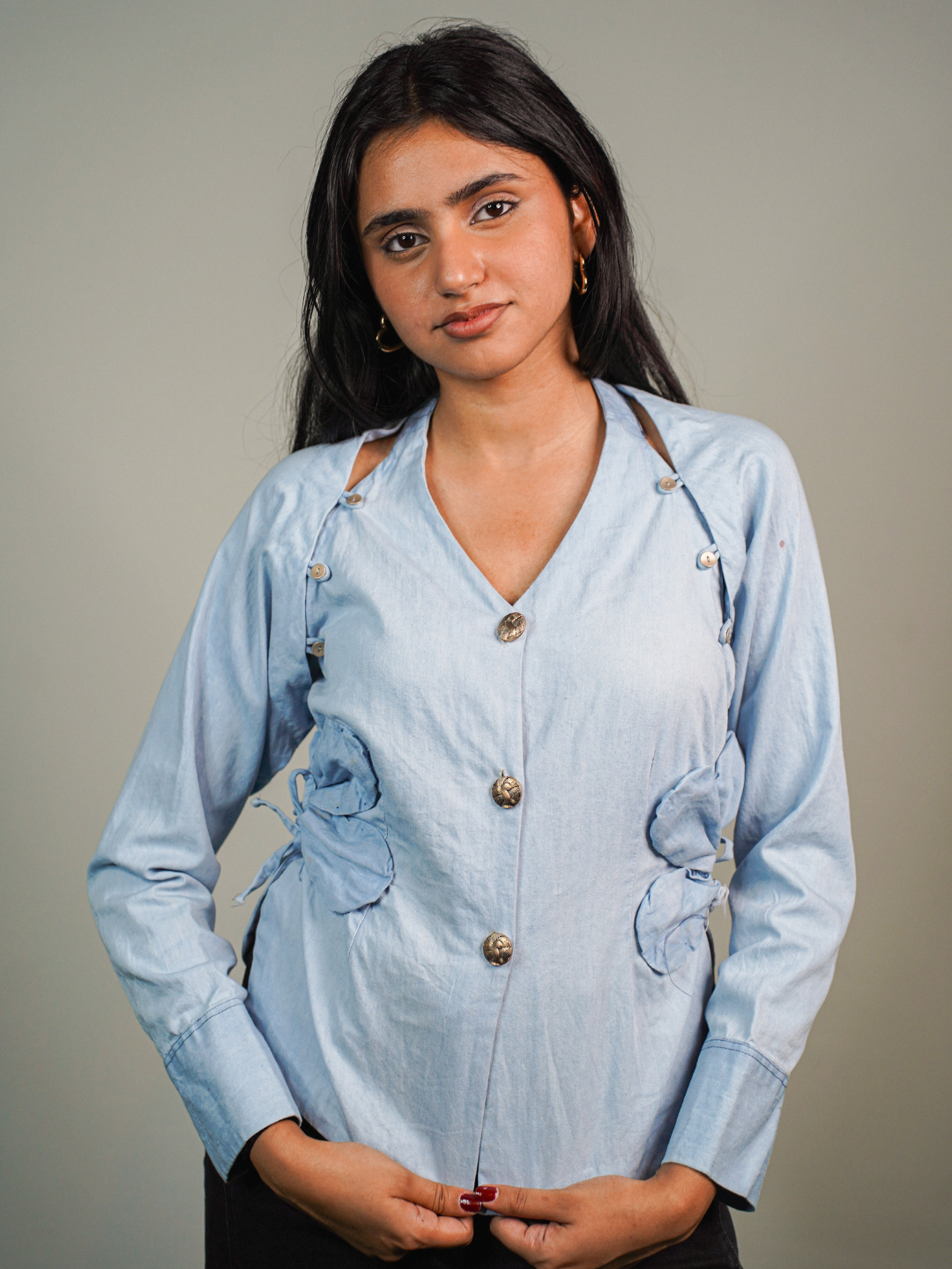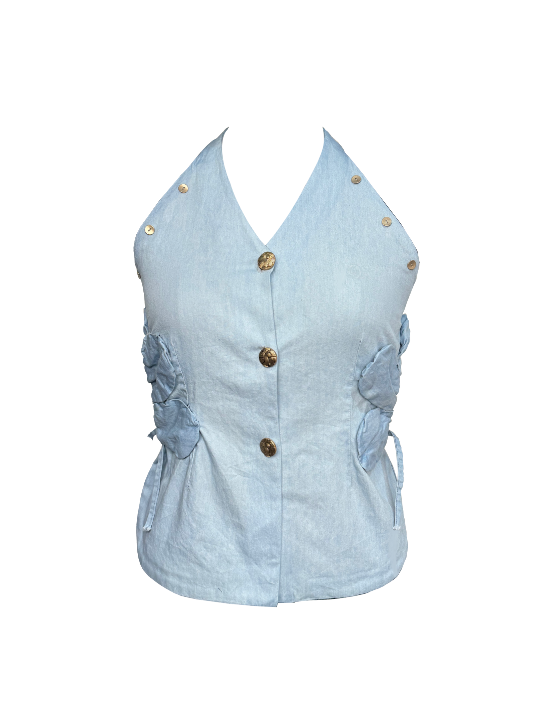 Introducing the Julia Top a fresh take on structured elegance. Crafted in sturdy denim, this waistcoat style top features delicate floral detailing at the waist, designed to cinch and flatter the silhouette effortlessly. The highlight? Detachable sleeves that transform into a separate shrug, allowing you to style it your way layered, solo, or with flair. Brass button accents add a vintage charm to this versatile piece, making it perfect for dressing up or down. Whether you're styling it for a brunch date or layering it for a creative twist, the Julia Top brings thoughtful design and everyday elegance together in one timeless piece.
