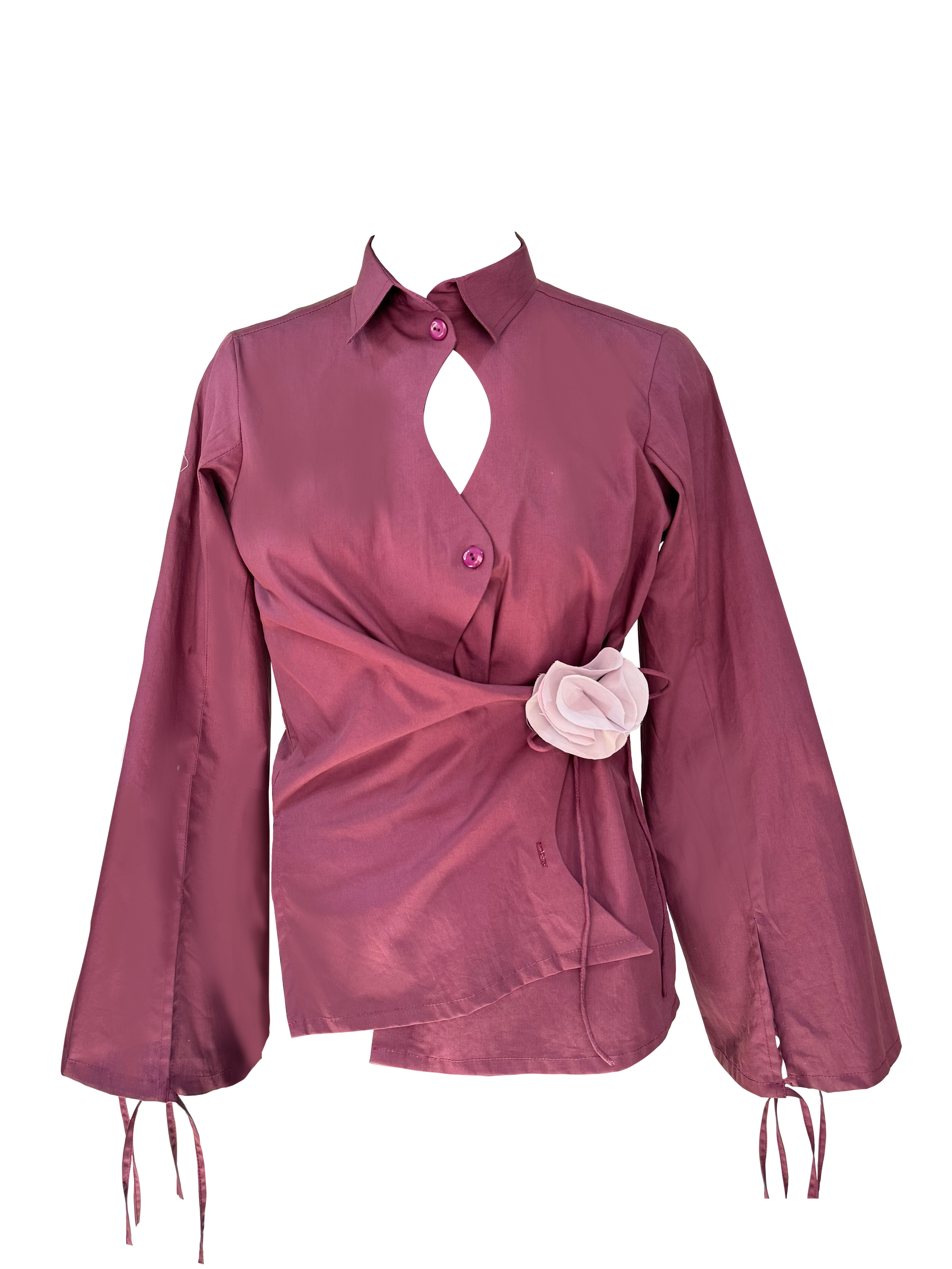 Introducing the Olivia Shirt, a timeless piece with thoughtful details that make all the difference. Made from soft, breathable cotton, it features a delicate curvy placket that adds a subtle elegance to the silhouette. A front tie-up detail allows you to style it your way, cinched or relaxed. The long, flared sleeves are adorned with adjustable tie-ups for added charm. It also comes with a handcrafted fabric floral brooch, giving you the freedom to accessorize and express your mood and wear it on the collar, chest, or even in your hair. Feminine, flexible, and effortlessly graceful.
