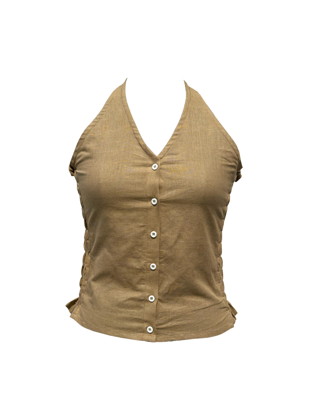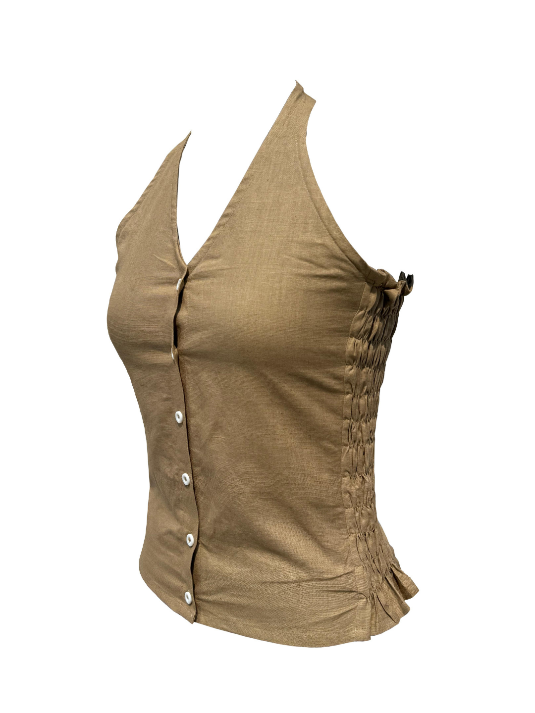 The Sylvie Top in tan linen is an ode to easy summer days. Crafted in ultra-breathable fabric, it features a flattering halter neckline in front and backless for that effortless charm. With soft smocking on the sides, it offers a close, comfortable fit that moves with you. Light, airy, and endlessly versatile, this backless wonder is perfect for layering or wearing on its own when the sun’s out.