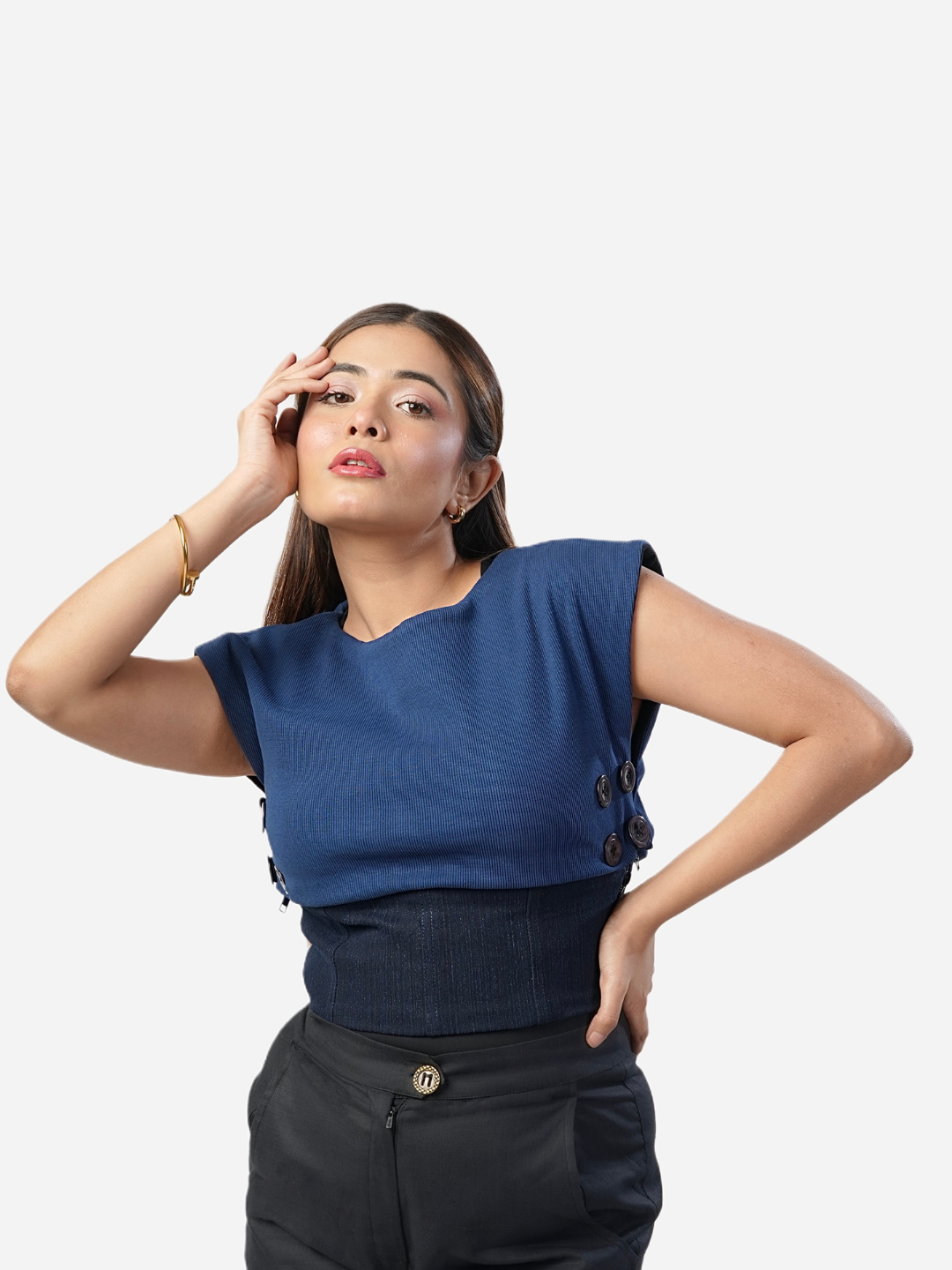 The sweater-like upper features power shoulders and is fully reversible, showcasing a contrasting color on the flip side for added versatility. Wear it as a sweater, flip it for a fresh look, or style it as a standalone bib or layered garment. The corset-inspired denim belt completes the design, doubling as a chic separate that can elevate any outfit.