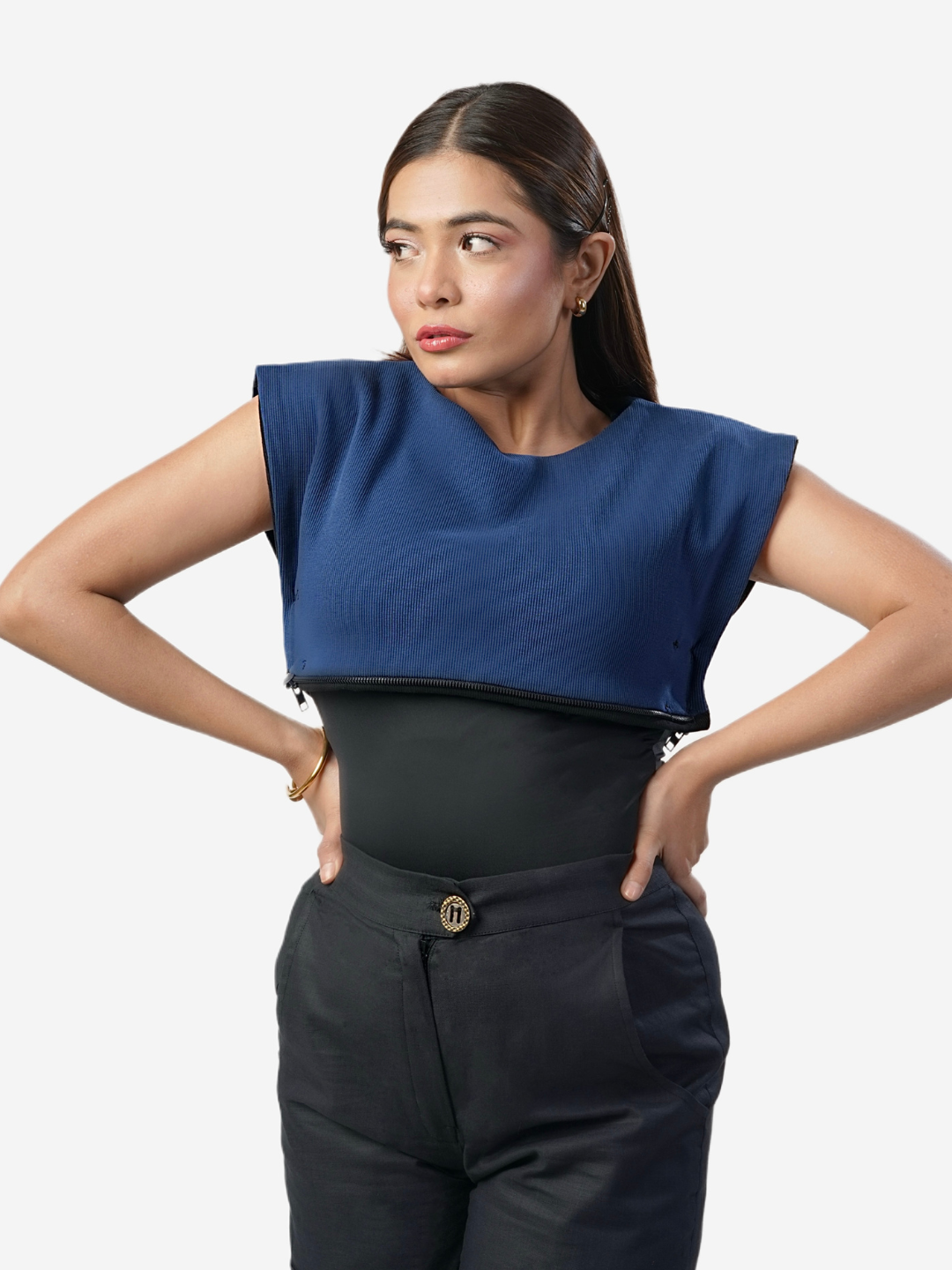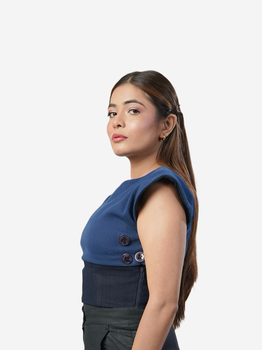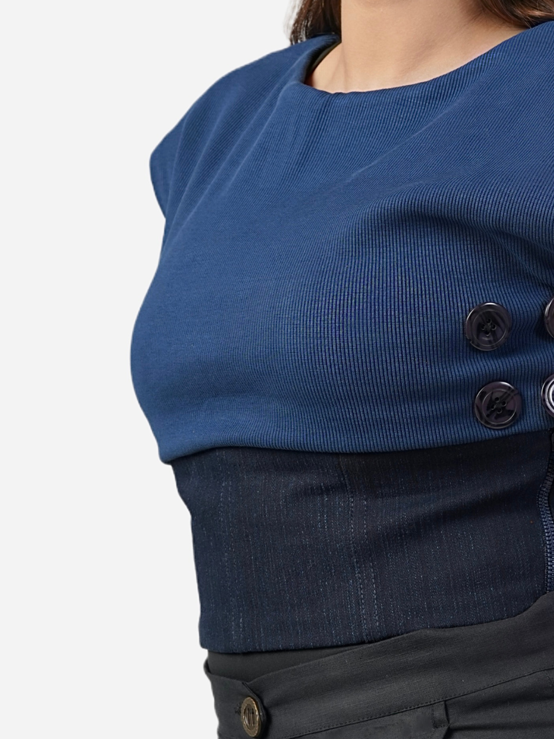 The Tan-Toe Top is a bold and versatile statement piece, designed for those who love to experiment with their style. Combining soft ribbed fabric with sturdy denim, this top offers a unique, multifunctional design.