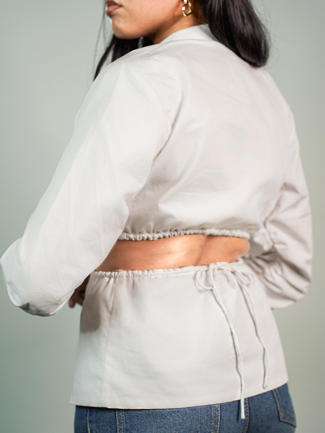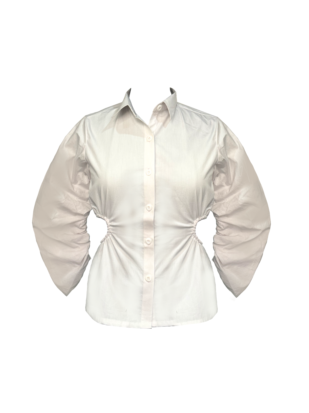 Meet the Valerie Shirt, where minimalism meets a playful edge. Crafted from soft, breathable cotton, this piece blends structure with subtle statement details. The waist features delicate cut-out detailing on both sides that continues to the back, finished with a soft tie-up, creating an elegant and feminine silhouette. The sleeves come with an adjustable drawstring, letting you gather one side for an asymmetrical flair or keep it clean and classic. It’s effortlessly versatile and perfect for when you want your outfit to speak softly, but leave a lasting impression.